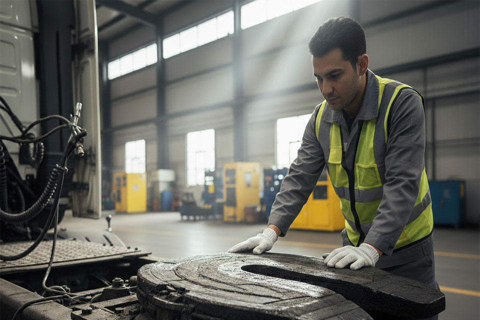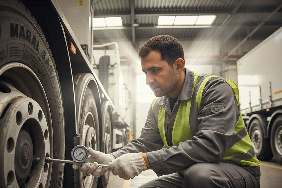 - لاستیک و چرخها: وضعیت تمام لاستیک و چرخها (هم کامیون و هم تریلی) را بررسی کنید. فشار باد را به صورت بصری چک کنید و به دنبال هرگونه بریدگی عمیق، تورم، آج کم یا فرسایش نامنظم باشید. در محورهای تریلی به دنبال نشانههای داغ شدن چرخ یا مهره باشید.